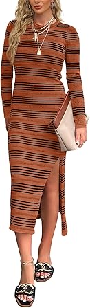 Womens Long Sleeve Sweater Dress Sriped Slim Fitted Soft Dresses Side Slit 2024 Fall/Winter Fashion