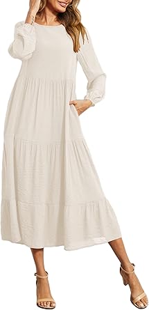 Womens 2024 Spring Dresses Long Sleeve Casual Crew Neck High Waist Ruffle Tiered A Line Swing Mini Cute Dress