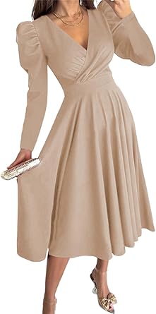 Womens Wrap V Neck Long Sleeve High Waist Vintage Wedding Guest Cocktail Party Swing A Line Midi Dresses