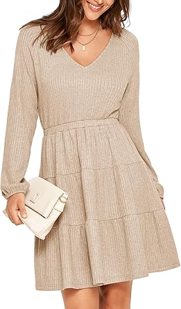 Women's Long Sleeve Mini Sweater Dress 2024 Fall Ribbed Knit Dress Casual V Neck Ruffle Flowy Tiered Dresses