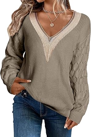Womens Long Sleeve Sweaters Fall 2024 Trendy Sexy Lace V Neck Knit Drop Shoulder Pullover Sweater Jumper Tops
