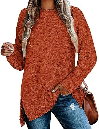Women's Long Sleeve Fuzzy Knitted Sweater Popcorn Side Split Loose Pullover Tops