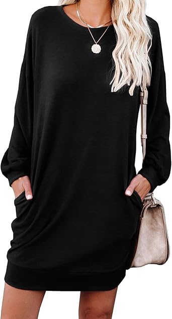 Women's Long Sleeves Dresses Causal Loose Round-Neck Tuinc Tops Basic Dress with Side Pockets