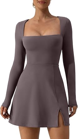 Womens Square Neck Bodice Dress Long Sleeve Side Slit Flare Mini Dresses