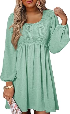 Womens 2024 Casual Dress Smocked Crewneck Button Up Long Sleeve Empire Waist A-Line Mini Dress