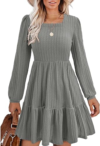 Women's Casual Knit Sweater Dress Square Neck Long Sleeve Knee Length Babydoll Dresses Trendy 2024