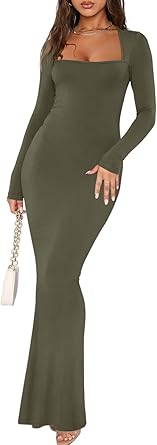 Womens Basic Sexy Square Neck Long Sleeve Soft Lounge Long Dress Fall Casual Ribbed Bodycon Maxi Dresses