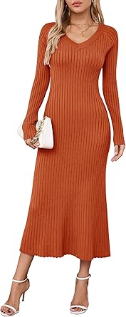 2024 Fall Womens V Neck Long Sleeve Fishtail Sweater Dress Ribbed Knit Slim Fit Bodycon Midi Dress