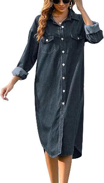 Women Button Down Denim Midi Shirt Dress Long Sleeve Jean Dress with Pockets