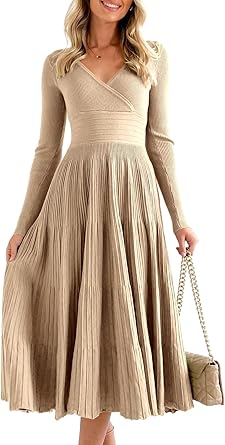 Womens Long Sleeve Midi Sweater Dress Wrap V Neck Pleated A Line Fit Flare Elegant Knit Maxi Dress
