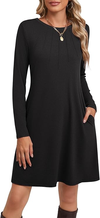 Women's Casual Long Sleeve Dresses Crew Loose Fall Waist Pleated Long Dress Knee Length Basic Dress with Pockets